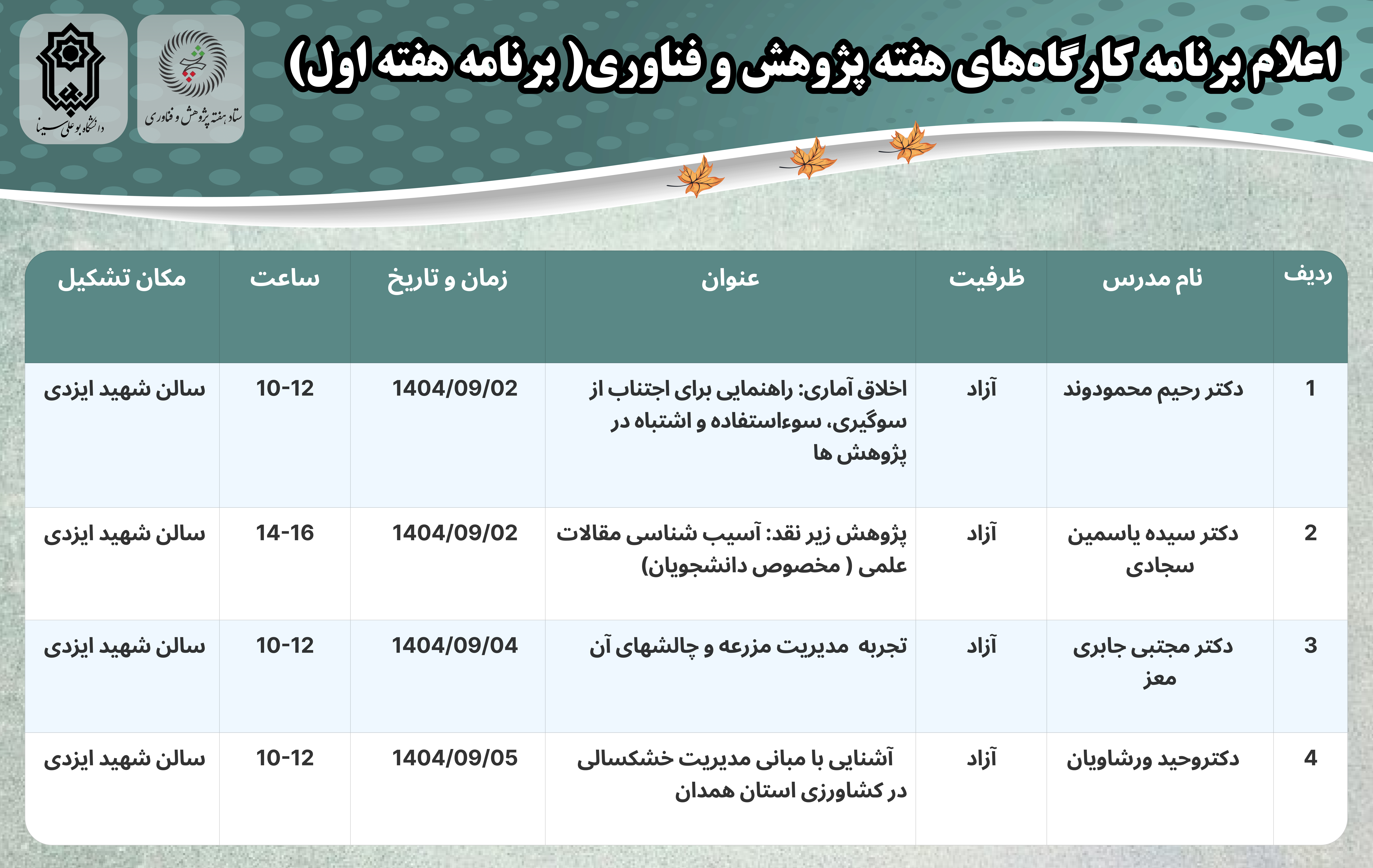 اعلام برنامه کارگاههای هفته اول پژوهش