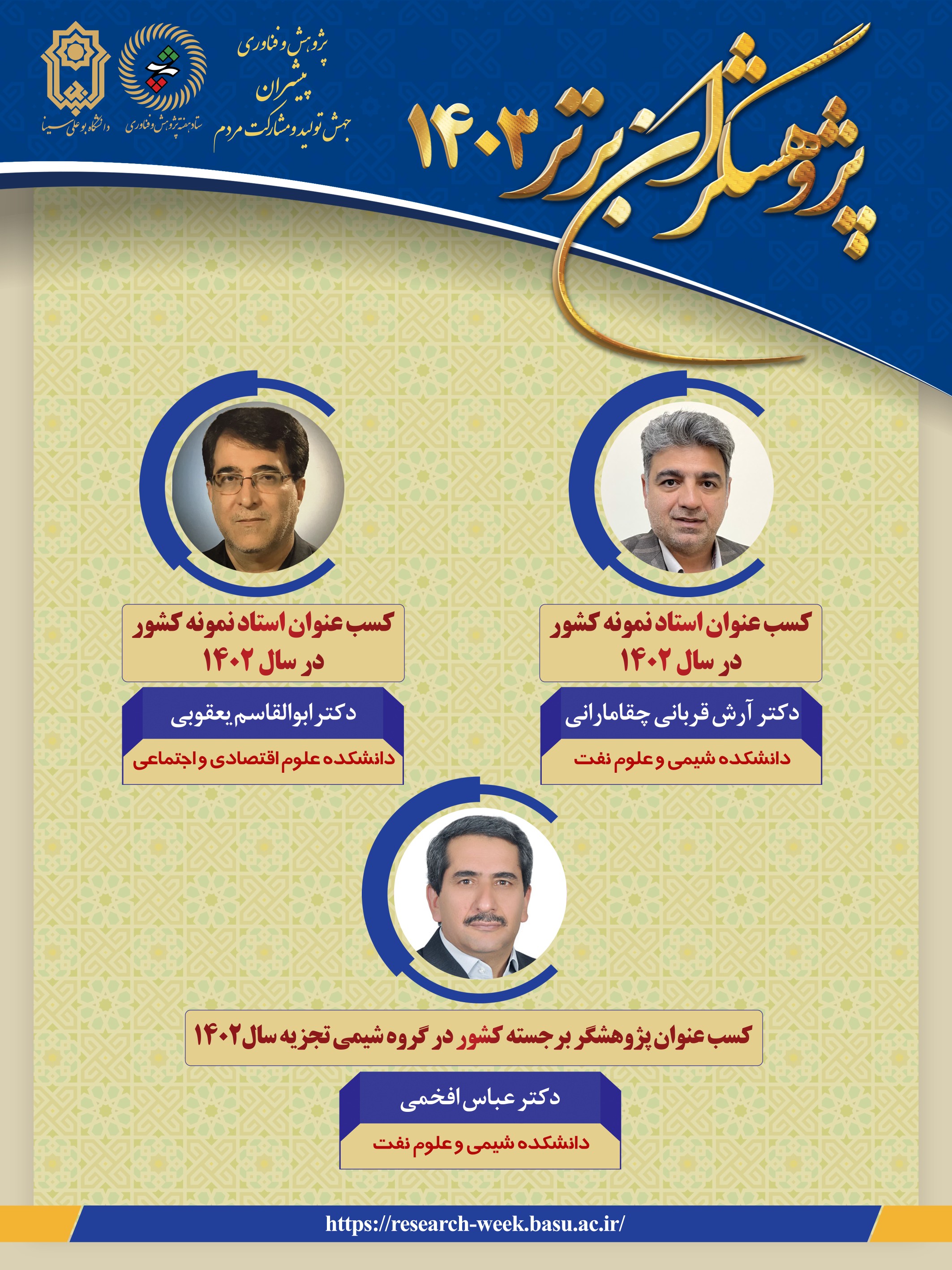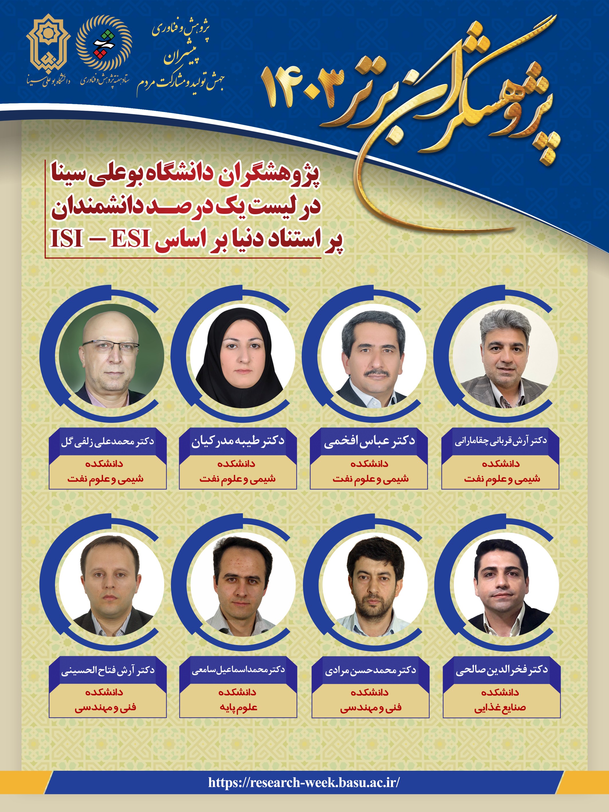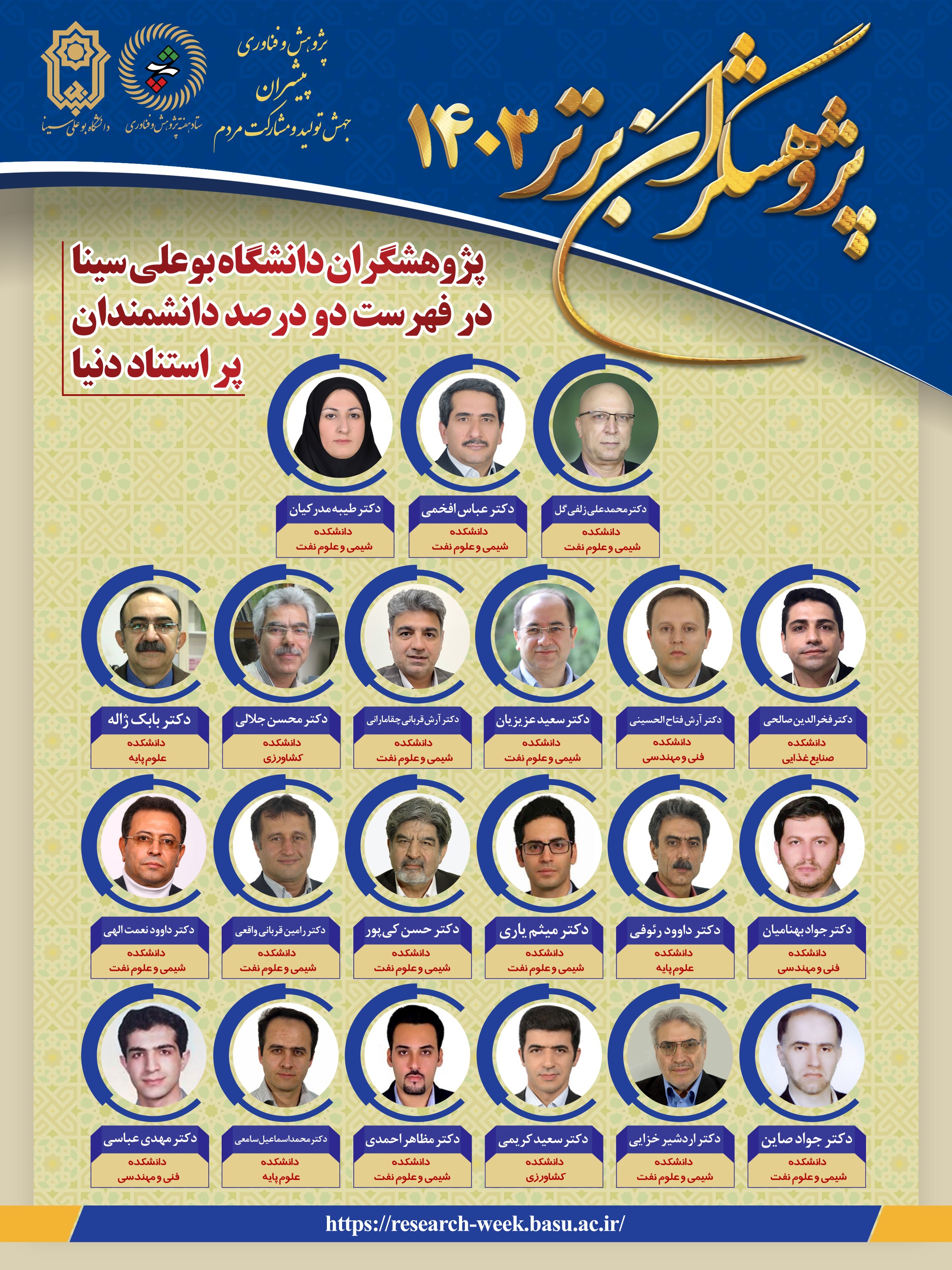 به مناسبت هفته پژوهش و فناوری، دانشمندان در فهرست یک درصد پراستناد دنیا، دانشمندان در فهرست دو درصد پر استناد دنیا، دانشمندان پر استناد علوم انسانی، علوم اجتماعی و هنر و معماری و اساتید نمونه کشوری دانشگاه بوعلی سینا انتخاب و معرفی شدند. این انتخاب بر اساس معیارهای علمی، مقالات پژوهشی، فعالیت‌های فناورانه و دستاوردهای برجسته در حوزه‌های مختلف علمی صورت گرفت.