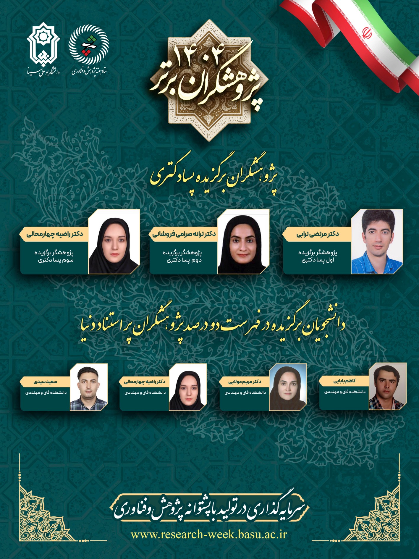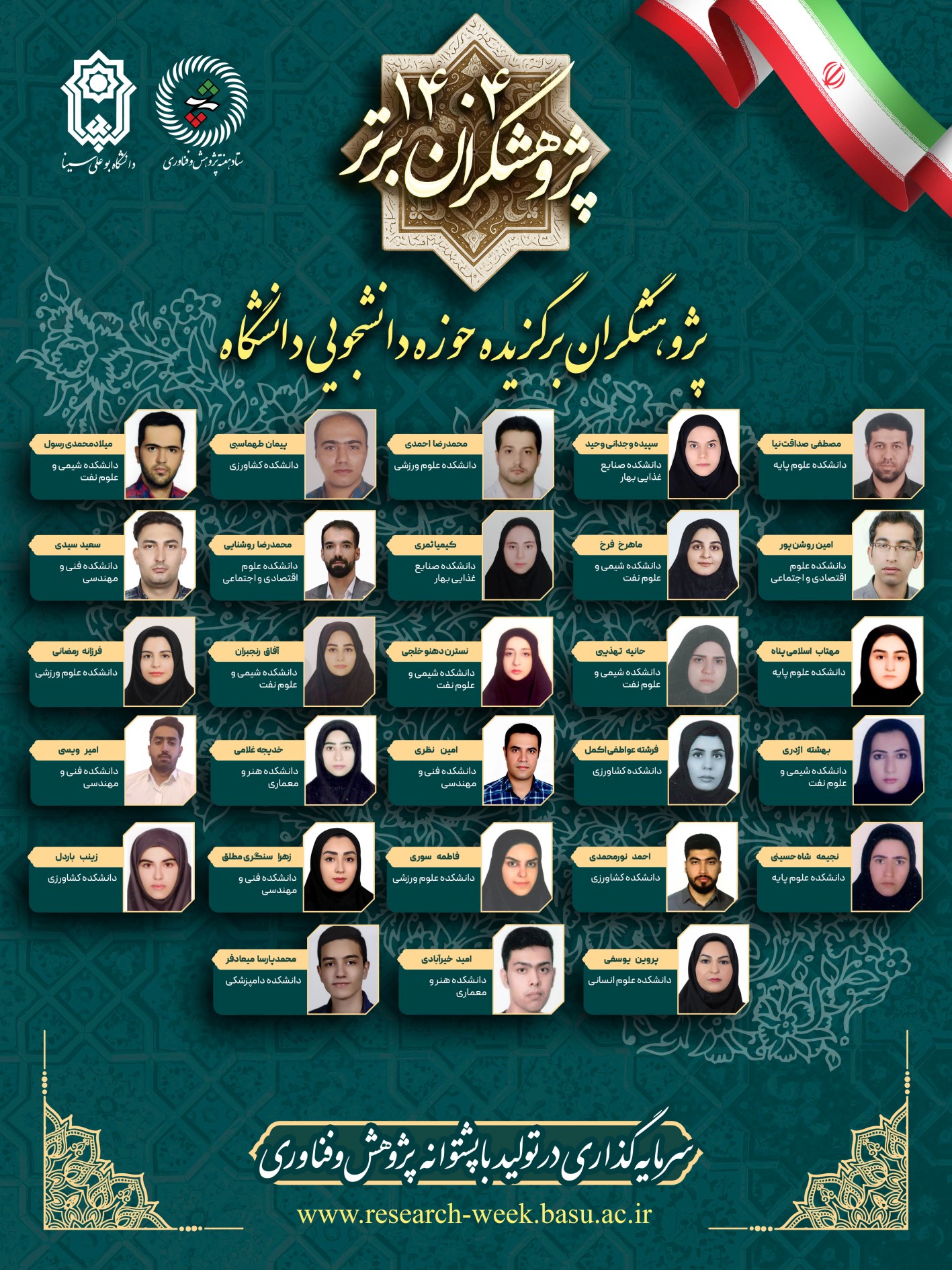 به مناسبت هفته پژوهش و فناوری، دانشجویان در فهرست دو درصد دانشمندان پراستناد دنیا، دانشجویان پسادکترا و پژوهشگران برتر حوزه دانشجویی و کارمندی دانشگاه بوعلی سینا انتخاب و معرفی شدند. این انتخاب بر اساس معیارهای علمی، مقالات پژوهشی، فعالیتهای فناورانه و دستاوردهای برجسته در حوزههای مختلف علمی صورت گرفت.