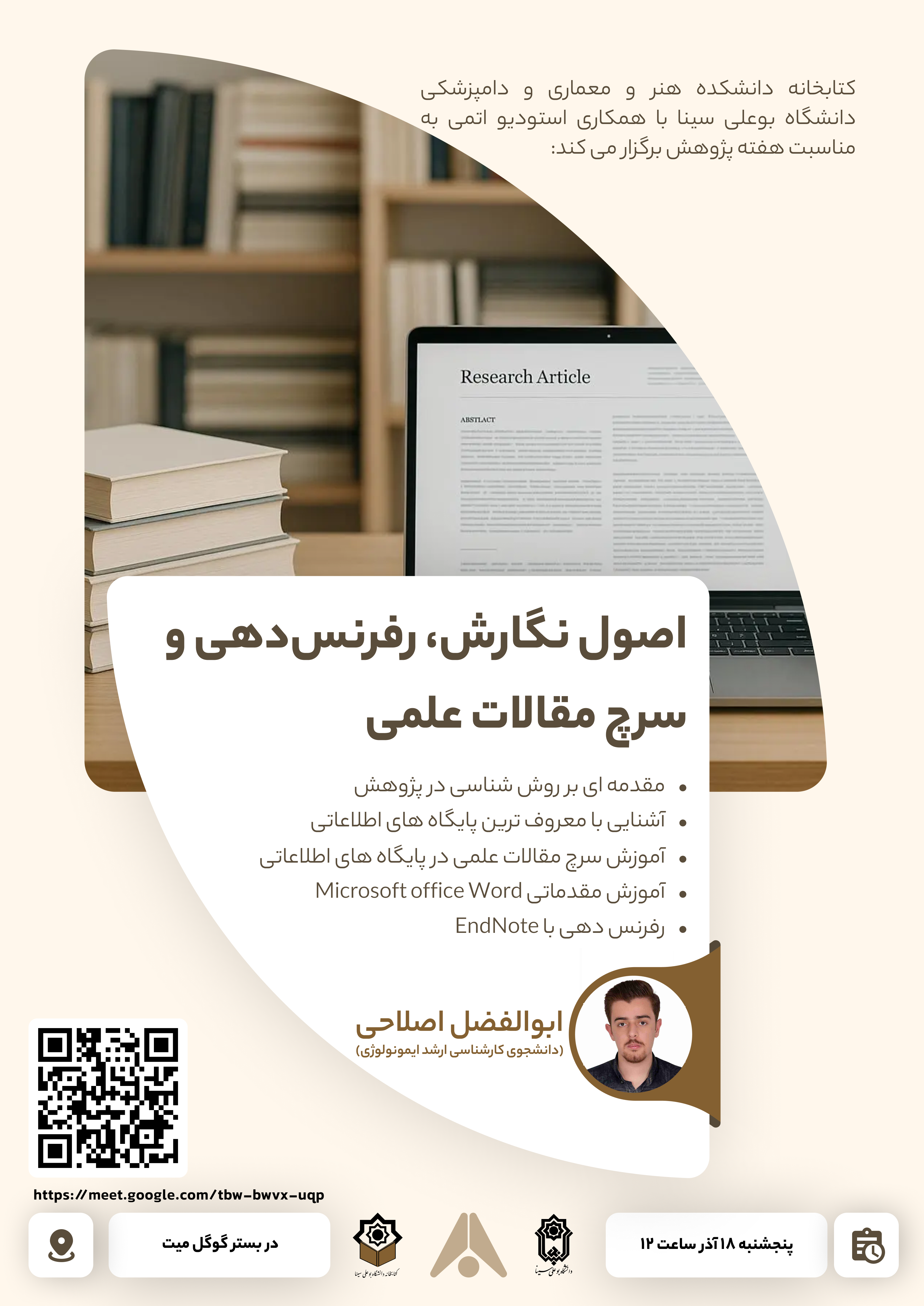 به مناسبت هفته پژوهش و فناوری، کتابخانه دانشکده هنر، معماری و دامپزشکی دانشگاه بوعلیسینا با همکاری استودیو تمی، کارگاه آموزشی «اصول نگارش، رفرنسدهی و سرج مقالات علمی» را برگزار میکند.